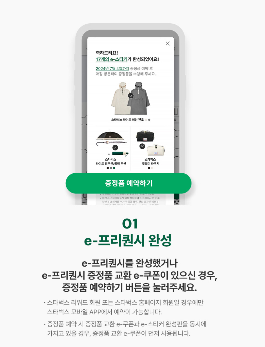 이벤트 기간은 2024년 5월 16일부터 7월 4일로, 미션 음료 3잔 포함 총 17잔의 음료를 구매하면 스타벅스 라이트 레인 판초, 라이트 우산, 투웨이 파우치 중 1개를 증정하는 형태랍니다.